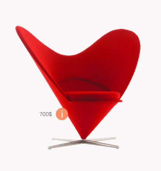 【潘通心形椅】维纳尔•潘顿在一年后又设计出了一款同样引人注意的座椅。 设计师从心形的轮廓创造了在当时被认为是颠覆传统产品, 而它的确为座椅概念下了新定义,开创了几何形椅子的先河, 适用于餐馆、酒吧、宾馆、loft等开放空间。